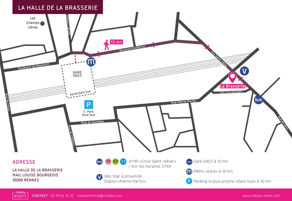 A partir de la gare, 12minutes à pied, et desservie par les lignes de bus C1, C2 et 11 (Arrêt croix Saint-Hélier).